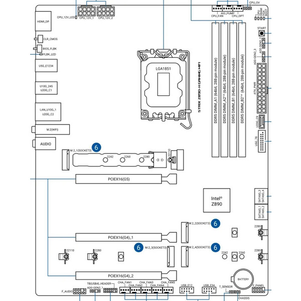 : | 1x M.2/M-Key (PCIe 5.0 x4, 22110/2280/2260/2242), 1x M.2/M-Key (PCIe 4.0 x4, 2280), 1x M.2/M-Key (PCIe 4.0 x4, 22110/2280), 1x M.2/M-Key (PCIe 4.0 x4/SATA, 2280/2260/2242), 1x M.2/E-Key (2230, occupied with WiFi BT module) | M2-Slots |