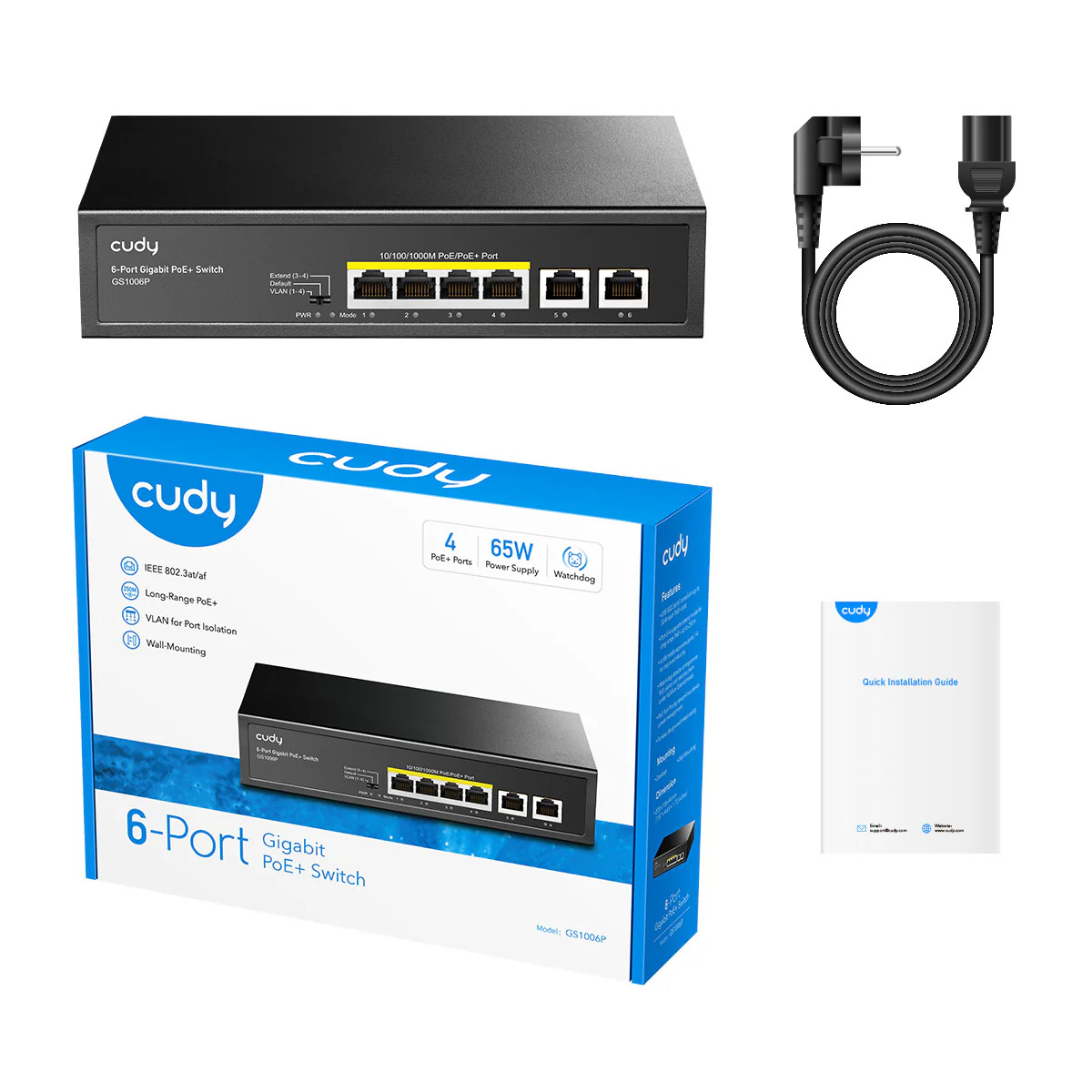 6-Port Gigabit PoE Switch - A rack-mounted 6-GbE PoE switch with a 65W power supply and a silent cooling system - 4x GbE with 802.3at/af Mode A PoE - 2x Uplink GbE