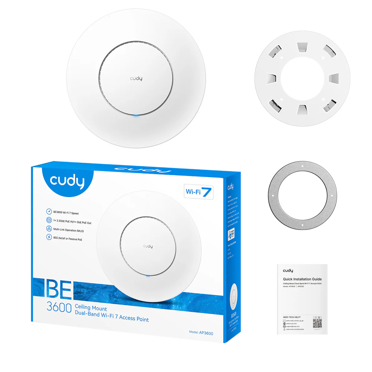 BE3600 Dual Band Ceiling Mount Wi-Fi 7 Access Point, 1 x 2.5G RJ45 Port, PoE or Passive PoE, 12V DC adapter included, Cudy Mesh Support