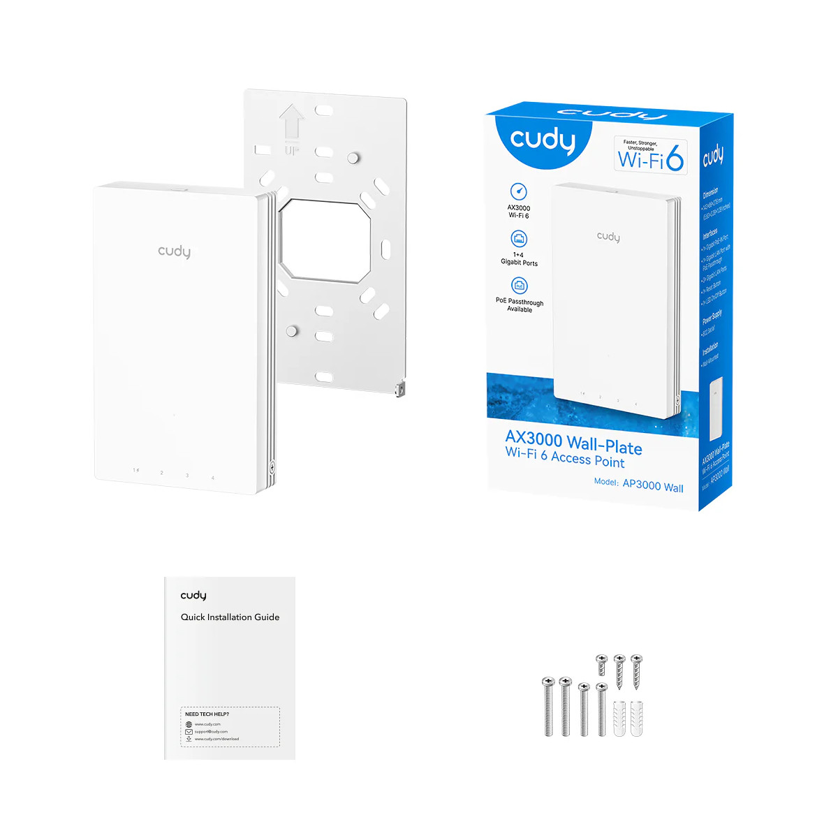 AX3000 Dual Band Wi-Fi 6 Wall Plate Access Point, 1 x Gigabit PoE-IN Port, 4 x Gigabit RJ45 ports, LAN1 support PoE Out, Cudy Mesh Support