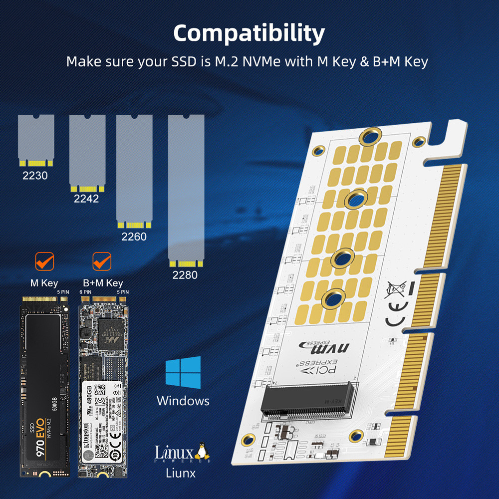 M.2 NVMe SSD to PCIe 3.0 X16/X8/X4 Adapter Converter Card Support M.2 Hard Drive Speed Up,2230 2242 2260 2280,Compatible with Windows 7/8/10 and Linux